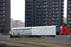 The "Train on Train" concept was announced in 2006[2] and a full-size mockup vehicle was built and demonstrated at Naebo Works in 2007. The next phase was to build a prototype train for actual operation.[1][needs update] JR Freight was developing new Class EH800 20/25 kV AC electric locomotives to haul these and other trains through the tunnel.[3]