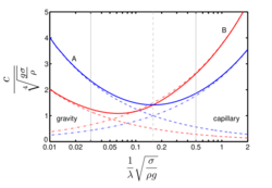 For a certain water depth, surface gravity waves – i.e. waves occurring at the air–water interface and gravity as the only force restoring it to flatness – propagate faster with increasing wavelength. On the other hand, for a given (fixed) wavelength, gravity waves in deeper water have a larger phase speed than in shallower water.[1] In contrast with the behavior of gravity waves, capillary waves (i.e. only forced by surface tension) propagate faster for shorter wavelengths.