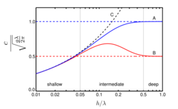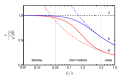 Dispersion of gravity waves on a fluid surface. Phase and group velocity divided by shallow-water phase velocity √gh as a function of relative depth h / λ. Blue lines (A): phase velocity; Red lines (B): group velocity; Black dashed line (C): phase and group velocity √gh valid in shallow water. Drawn lines: dispersion relation valid in arbitrary depth. Dashed lines (blue and red): deep water limits. |