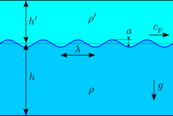 where again ρ and ρ′ are the densities below and above the interface, while coth is the hyperbolic cotangent function. For the case ρ′ is zero this reduces to the dispersion relation of surface gravity waves on water of finite depth h.