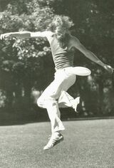 Disc freestyle, also known as freestyle Frisbee in reference to the trademarked brand name, is a sport and performing art characterized by creative, acrobatic, and athletic maneuvers with a flying disc. Freestyle is performed individually or more commonly in groups, both competitively and recreationally. In the early 1970s before the invention of the "nail-delay", freestyle catching possibilities would depend on the throw you were given; it was always spontaneous and unpredictable. Play with this type of freestyle was performed with two players standing 30-40 yards apart. The throws were fast and varied, and the catches were right off the throw, except for the occasional kick or slap-up and rarely a pause between the catch and the throw back. At advanced levels, the throws and catches would become a flow that was created once you mastered the basics. It was fast and fluid and visibly would resemble martial arts and dance.[16] Most competitive freestyle today centers around the nail-delay with many players using what are called delay-aids (plastic nails and silicone sprays).