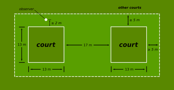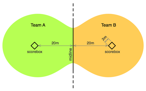 Double disc court (DDC) invented and introduced by Frisbee Hall of Fame inductee Jim Palmeri of Rochester, NY, is a sport played with two flying discs.[24] Two teams of two players each stand in their own courts. The goal is to defend a court from an attack by the opposing team. Two identical square courts are located on a level playing field of grass measuring 13 meters on a side. The distance between the courts is 17 meters. Attacks are made in two ways: by throwing a disc in play into the opponents' court in an attempt to have the disc come to rest within that court without ever having touched out-of-bounds, or by causing both discs to be touched by a player or players on the opposing team at the same time (called a "double"). A team scores a point whenever they make a successful attack or whenever an opponent throws a disc out-of-bounds. The first team to score the requisite number of points as determined by the competitive format wins the game.