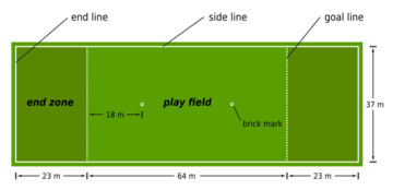 | Schtick disc | an Ultimate variant played with two discs where running with the disc is allowed;[12] generally more forgiving operations of play than most team sports makes the game more fun and accessible to players of varied abilities than traditional ultimate.[13] The game was conceived and pioneered by a group of friends from Delaware, USA and/or graduates of Rice University, and was first played in 1994 on Assateague Island.[14] It has since been played throughout the US and in Australia as well, having been featured at Sydney's Longest Day Beach Ultimate Tournament since 2001. Typically a football half-way line is used to mark the midline, as precise knowledge of the line's position is frequently required for tactical play. Scoreboxes can be marked out by any means that is easily visible, though traditionally bundled socks or knotted rags have been used.[15] |