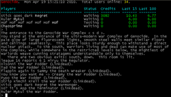 ↑Busey 1995, p. 200, "The TinyFugue system has long been a popular client interface for players of MOO, MUCK, and many TinyMUD-derivative systems. With a robust feature list supporting multiple sessions, macros, triggers and automation, command history and other functions, TinyFugue offers users maximum control over their environment. Although more recent programs such as Tintin++ have gained large followings, many MUD players continue to use TinyFugue because of its power and flexibility in the hands of an experience client programmer."