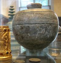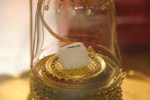 The Kanishka casket is said to have contained three bone fragments of the Buddha,[70] which were forwarded to Burma by the British following the excavation,[71] where they still remain in U Khanti's dezaung (hall).