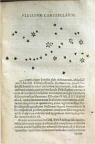 Galileo Galilei was the first astronomer to view the Pleiades through a telescope.[49] He thereby discovered that the cluster contains many stars too dim to be seen with the naked eye. He published his observations, including a sketch of the Pleiades showing 36 stars, in his treatise Sidereus Nuncius in March 1610.