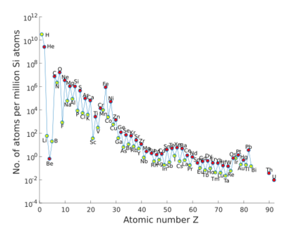 The composition of the solar system is similar to that of many other stars, and aside from small anomalies it can be assumed to have formed from a solar nebula that had a uniform composition, and the composition of the Sun's photosphere is similar to that of the rest of the Solar System. The composition of the photosphere is determined by fitting the absorption lines in its spectrum to models of the Sun's atmosphere.[23] By far the largest two elements by fraction of total mass are hydrogen (74.9%) and helium (23.8%), with all the remaining elements contributing just 1.3%.[24] There is a general trend of exponential decrease in abundance with increasing atomic number, although elements with even atomic number are more common than their odd-numbered neighbors (the Oddo–Harkins rule). Compared to the overall trend, lithium, boron and beryllium are depleted and iron is anomalously enriched.[25]:284–285