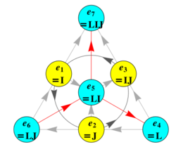 | [math]\displaystyle{ j }[/math] | [math]\displaystyle{ j }[/math] | [math]\displaystyle{ -k }[/math] | [math]\displaystyle{ -1 }[/math] | [math]\displaystyle{ i }[/math] | [math]\displaystyle{ -\ell j }[/math] | [math]\displaystyle{ \ell k }[/math] | [math]\displaystyle{ \ell }[/math] | [math]\displaystyle{ -\ell i }[/math] | |