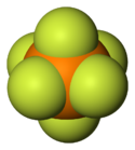 Seventeen elements are known to form binary hexafluorides.[2] Nine of these elements are transition metals, three are actinides, four are chalcogens, and one is a noble gas. Most hexafluorides are molecular compounds with low melting and boiling points. Four hexafluorides (S, Se, Te, and W) are gases at room temperature (25 °C) and a pressure of 1 atm, two are liquids (Re, Mo), and the others are volatile solids. The group 6, chalcogen, and noble gas hexafluorides are colourless, but the other hexafluorides have colours ranging from white, through yellow, orange, red, brown, and grey, to black.