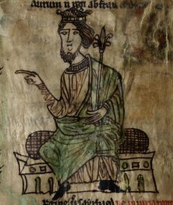 A mid-13th-century illustration from the Laws of Hywel Dda book of a 10th century Welsh king, Hywel Dda, the earliest known illustration of a smile.
