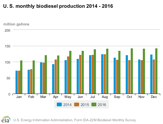 As of December 2016, the United States had 96 plants producing biodiesel. These facilities had a production capacity of 2.3 billion gallons per year as of December 2016. In the month of December 2016, the United States produced 143 million gallons of biodiesel. The chart below shows monthly biodiesel production in the United States from 2014 to 2016.[25]