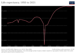 The Tutsi RPF restarted their offensive, and took control of the country methodically, gaining control of the whole country by mid-July.[54] The international response to the genocide was limited, with major powers reluctant to strengthen the already overstretched UN peacekeeping force.[55] When the RPF took over, approximately two million Hutu fled to neighbouring countries, in particular Zaïre, fearing reprisals;[56] additionally, the RPF-led army was a key belligerent in the First and Second Congo Wars.[57] Within Rwanda, a period of reconciliation and justice began, with the establishment of the International Criminal Tribunal for Rwanda (ICTR) and the reintroduction of Gacaca, a traditional village court system.[58] Since 2000 Rwanda's economy,[59] tourist numbers,[60] and Human Development Index have grown rapidly;[61] between 2006 and 2011 the poverty rate reduced from 57% to 45%,[62] while life expectancy rose from 46.6 years in 2000[63] to 65.4 years in 2021.[64]