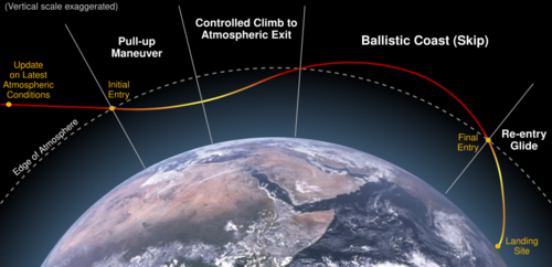 Skip is a flight trajectory where the spacecraft goes in and out the atmosphere. Glide is a flight trajectory where the spacecraft stays in the atmosphere for a sustained flight period of time.[1] In most examples, a skip reentry roughly doubles the range of suborbital spaceplanes and reentry vehicles over the purely ballistic trajectory. In others, a series of skips allows the range to be further extended.