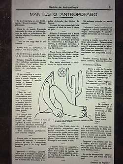 The Manifesto Antropófago (or Manifesto Antropofágico) was a statement published in 1928 by the Brazilian poet and polemicist Oswald de Andrade, an important figure in the cultural movement of Brazilian modernism. It was inspired by Abaporu, a painting by Tarsila do Amaral, a modernist artist and Oswald's wife. Read in 1928 to his friends at Mário de Andrade's house, it was published in the Revista de Antropofagia, which Oswald helped found with Raul Bopp and Antônio de Alcântara Machado, with the date "year 374 of the swallowing of Bishop Sardinha".[2][1]