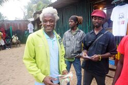 The scholar Maureen Warner-Lewis observed that Rastafari combined a "radical, even revolutionary" stance on socio-political issues, particularly regarding race, with a "profoundly traditional" approach to "philosophical conservatism" on other religious issues.[98] Rastas typically look critically upon modern capitalism with its consumerism and materialism.[93] They favour small-scale, pre-industrial and agricultural societies.[99] Some Rastas have promoted activism as a means of achieving socio-political reform, while others believe in awaiting change that will be brought about through divine intervention in human affairs.[100] In Jamaica, Rastas typically do not vote,({{{1}}}, {{{2}}}) derogatorily dismissing politics as "politricks",[101] and rarely involve themselves in political parties or unions.[102] The Rasta tendency to believe that socio-political change is inevitable opens the religion up to the criticism from the political left that it encourages adherents to do little or nothing to alter the status quo.({{{1}}}, {{{2}}}) Other Rastas do engage in political activism; the Ghanaian Rasta singer-songwriter Rocky Dawuni for instance was involved in campaigns promoting democratic elections,[103] while in Grenada, many Rastas joined the People's Revolutionary Government formed in 1979.[104]