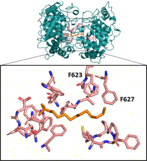 Next, a squalene-hopene cyclase catalyzes an elaborate cyclization reaction, engaging squalene in an energetically favorable all-chair conformation before creating 5 cycles, 6 covalent bonds, and 9 chiral centers on the molecule in a single step.[24][25] This enzyme, coded for by the gene shc (also called hpnF in some bacteria), has a double ⍺-barrel fold characteristic of terpenoid biosynthesis[26] and is present in the cell as a monotopic homodimer, meaning pairs of the cyclase are embedded in but do not span the plasma membrane.[24][27] In vitro, this enzyme exhibits promiscuous substrate specificity, also cyclizing 2,3-oxidosqualene.[28]