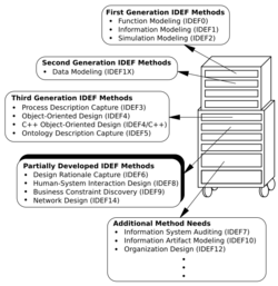 The significance of these models to data interchange for manufacturing and materials flow was recognized early in the Air Force Integrated Computer Aided Manufacturing (ICAM) Project and gave rise to the IDEF formal modeling project.[6] IDEF produced a specification for a formal functional modeling approach (IDEF0) and an information modeling language (IDEF1).[7] The more recent "Product Data Exchange Specification" (PDES) project in the U.S., the related ISO Standard for the exchange of product model data (STEP) and the Computer Integrated Manufacture Open Systems Architecture (CIMOSA) [ISO87] project in the European Economic Community have whole heartedly accepted the notion that useful data sharing is not possible without formal semantic data models of the context the data describes.[4]