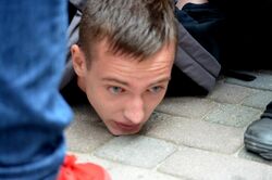 Russia's officials are similarly averse to Pride Parades. Mayor of Moscow Yury Luzhkov has repeatedly banned marches, calling them "satanic".[72] Pride participants instead tried to peacefully assemble and deliver a petition to city hall regarding the right of assembly and freedom of expression. They were met by skinheads and other protesters, and police who had closed off the square and immediately arrested activists as they entered. As some were being arrested, other participants were attacked by protesters. Police did nothing. Around eleven women and two men were arrested and left in the heat, denied medical attention, and verbally abused by police officers. The officers told the women, "No one needs lesbians, no one will ever get you out of here." When participants were released from custody hours later, they were pelted by eggs and shouted at by protesters who had been waiting.[46][73]