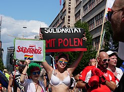 On July 20, 2019, the first Białystok equality march was held in Białystok, a Law and Justice party stronghold,[77] surrounded by Białystok county which is a declared LGBT-free zone.[78] Two weeks before the march Archbishop Tadeusz Wojda delivered a proclamation to all churches in Podlaskie Voivodeship and Białystok stating that pride marches were "blasphemy against God".[78] Wojda also asserted that the march was "foreign" and thanked those who "defend Christian values".[77] Approximately a thousand pride marchers were opposed by thousands of members of far-right groups, ultra football fans, and others.[79] Firecrackers were tossed at the marchers, homophobic slogans were chanted, and the marchers were pelted with rocks and bottles.[78][77][79] Dozens of marchers were injured.[78] Amnesty International criticized the police response, saying they had failed to protect marchers and "failed to respond to instances of violence".[80] According to the New York Times, similar to the manner in which the Unite the Right rally in Charlottesville shocked Americans, the violence in Białystok raised public concern in Poland over anti-LGBT propaganda.[78]