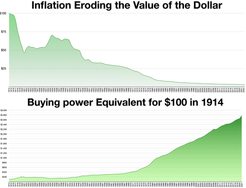 The table above shows the equivalent amount of goods that, in a particular year, could be purchased with $1. The table shows that from 1774 through 2012 the U.S. dollar has lost about 97.0% of its buying power.[76]