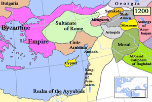In 1198, with the crowning of Leo I, King of Armenia of the Rubenid dynasty, Cilician Armenia became a kingdom.[5][6] In 1226, the crown was passed to the rival Hethumid dynasty through Leo's daughter Isabella's second husband, Hethum I. As the Mongols conquered vast regions of Central Asia and the Middle East, Hethum and succeeding Hethumid rulers sought to create an Armeno-Mongol alliance against common Muslim foes, most notably the Mamluks.[6] In the thirteenth and fourteenth centuries, the Crusader states and the Mongol Ilkhanate disintegrated, leaving the Armenian Kingdom without any regional allies. After relentless attacks by the Mamluks in Egypt in the fourteenth century, the Armenian Kingdom of Cilicia, then under the rule of the Lusignan dynasty and mired in an internal religious conflict, finally fell in 1375.[7]