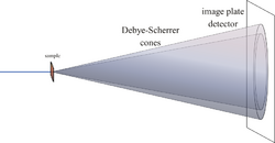 high-energy X-rays. HEX-rays entering from the left are diffracted in forward direction at the sample and registered by a 2D detector such as an image plate.