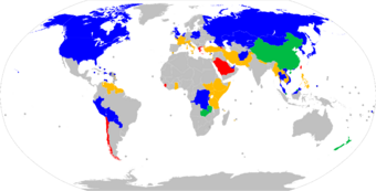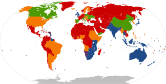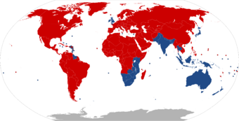 RHT is used in 165 countries and territories, mainly in the Americas, Continental Europe, northern Africa and mainland Asia (except South Asia), while 75 countries use LHT,[2] which account for about a sixth of the world's land area, a quarter of its roads, and about a third of its population.[3] In 1919, 104 of the world's territories were LHT and an equal number were RHT. Between 1919 and 1986, 34 of the LHT territories switched to RHT.[4]