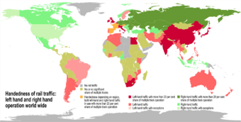 In most countries rail traffic travels on the same side as road traffic. However, there are many instances of railways built using LHT British technology which remained LHT despite their nations' road traffic becoming RHT. Examples include: Argentina, Belgium, Bolivia, Cambodia, Chile, China, Egypt, France, Iraq, Israel, Italy, Laos, Monaco, Morocco, Myanmar, Nigeria, Peru, Portugal, Senegal, Slovenia, Sweden, Switzerland, Taiwan, Tunisia, Uruguay and Venezuela. In Indonesia it is the reverse (RHT for rails (even for newer rail systems such as the LRT and the MRT systems) and LHT for roads). France is mainly LHT for trains except for the classic lines in Alsace–Lorraine,[100] which were converted from LHT to RHT under German administration from 1870 to 1918. In North America, multi-track rail lines with centralized traffic control are typically signaled to allow operation on any track in both directions, and the side of operation will vary based on the railroad's specific operational requirements.[101] In practice however, rail traffic is more often RHT.