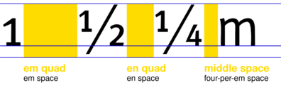 Both are encoded as characters in the General Punctuation code block of the Unicode character set as U+2000 EN QUAD and U+2001 EM QUAD, which are also defined to be canonically equivalent to U+2002 EN SPACE and U+2003 EM SPACE respectively.[2][3][4]