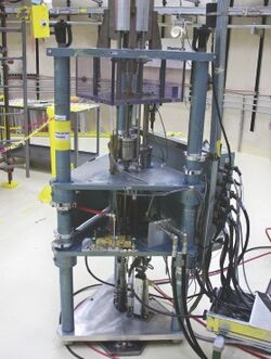 The radiation source within the Godiva device was a fissile metallic mass (usually highly enriched 235U),[3] about 11.8 inches (30 cm) in diameter. This was located at the top of a 6.5-foot (2 m) high metal tower. The burst of radiation was produced when a piston of fissile material was quickly inserted into and extracted from a cavity within the larger fissile mass. During the time these two masses were combined, they formed a critical mass and a nuclear chain reaction was briefly sustained.[2]