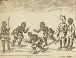 The first attestation of the use of the term was caphri, by Antonio Pigafetta of the Magellan expedition. They were described by the people of Suluan to the Magellan crew as dark-skinned, tattooed, and wore barkcloth (except for chieftains who wore a cloth headdress of silk), and had weapons ornamented with gold and large shields.[4]:150