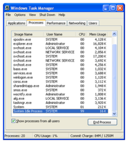 The Processes tab shows a list of all running processes on the system. This list includes Windows Services and processes from other accounts. The Delete key can also be used to terminate processes on the Processes tab. By default, the processes tab shows the user account the process is running under, the amount of CPU, and the amount of memory the process is currently consuming. There are more columns that can be shown. The Processes tab divides the process into three categories: