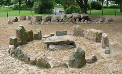 La Platte Mare a cist in circle, located on L'Ancresse common. Axes and arrow heads discovered.[18]