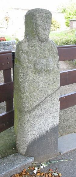 Castel Menhir standing stone 2m high depicting a female figure, discovered under the steps of the Castel church in 1878.[15]