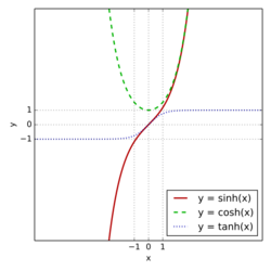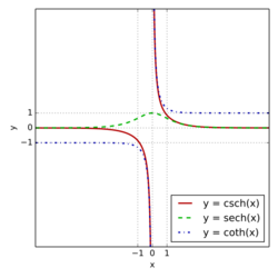 | [math]\displaystyle{ \sinh(z) }[/math] | [math]\displaystyle{ \cosh(z) }[/math] | [math]\displaystyle{ \tanh(z) }[/math] | [math]\displaystyle{ \coth(z) }[/math] | [math]\displaystyle{ \operatorname{sech}(z) }[/math] | [math]\displaystyle{ \operatorname{csch}(z) }[/math] |