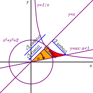 Since the area of a circular sector with radius r and angle u (in radians) is r2u/2, it will be equal to u when r = √2. In the diagram, such a circle is tangent to the hyperbola xy = 1 at (1,1). The yellow sector depicts an area and angle magnitude. Similarly, the yellow and red regions together depict a hyperbolic sector with area corresponding to hyperbolic angle magnitude.