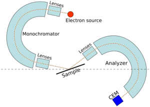 In the scattering process at the sample the electrons can lose energies from several 10−2 eV up to a few electron volt. The scattered electron beam which is of around 10−3 lower flux than the incident beam then enters, the analyzer, another CHA.