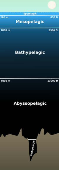 Deep ocean water is divided into layers or zones, each with typical features of salinity, pressure, temperature and marine life, according to their depth. Lying along the top of the abyssal plain is the abyssal zone, whose lower boundary lies at about 6,000 m (20,000 ft). The hadal zone – which includes the oceanic trenches, lies between 6,000 and 11,000 metres (20,000–36,000 ft) and is the deepest oceanic zone.[2][3]