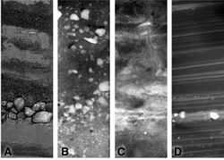 Terrigenous sediment is the most abundant sediment found on the seafloor. Terrigenous sediments come from the continents. These materials are eroded from continents and transported by wind and water to the ocean. Fluvial sediments are transported from land by rivers and glaciers, such as clay, silt, mud, and glacial flour. Aeolian sediments are transported by wind, such as dust and volcanic ash.[8]