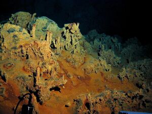 Other seabed environments include hydrothermal vents, cold seeps, and shallow areas. Marine life is abundant in the deep sea around hydrothermal vents.[17] Large deep sea communities of marine life have been discovered around black and white smokers — vents emitting chemicals toxic to humans and most vertebrates. This marine life receives its energy both from the extreme temperature difference (typically a drop of 150 degrees) and from chemosynthesis by bacteria. Brine pools are another seabed feature,[18] usually connected to cold seeps. In shallow areas, the seabed can host sediments created by marine life such as corals, fish, algae, crabs, marine plants and other organisms.