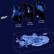 A stream of observations in the 1980s supported the presence of dark matter, including gravitational lensing of background objects by galaxy clusters,[49] the temperature distribution of hot gas in galaxies and clusters, and the pattern of anisotropies in the cosmic microwave background. According to consensus among cosmologists, dark matter is composed primarily of a not-yet-characterized type of subatomic particle.[50][51] The search for this particle, by a variety of means, is one of the major efforts in particle physics.[52]