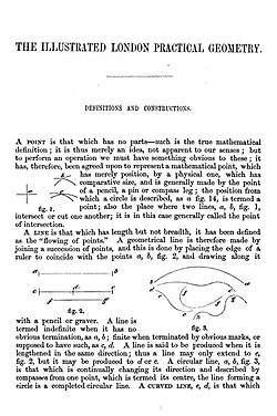 - "Practical Geometry is the basis of all drawing. As the combination of lines and curves of the various letters form the foundation of written language, so the like combinations in geometrical construction form, we conceive, the foundation of the art of general drawing in all its branches. We do not insist so much on the fact, that the Unes and figures known as geometrical, are to be found more or less strongly indicated in all the varied and graceful forms scattered before us—floating in the air—waving in the trees—adding beauty to the rich landscape, or mirrored in our glassy ponds; but we would rather impress upon the mind of the reader the importance of the truth, that a knowledge of Geometry is essentially requisite before an acquaintance with accurate drawing is attainable."[11]