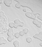 During the winter, much frost accumulates. It freezes out directly onto the surface of the permanent polar cap, which is made of water ice covered with layers of dust and sand. The deposit begins as a layer of dusty CO2 frost. Over the winter, it recrystallizes and becomes denser. The dust and sand particles caught in the frost slowly sink. By the time temperatures rise in the spring, the frost layer has become a slab of semi-transparent ice about 3 feet thick, lying on a substrate of dark sand and dust. This dark material absorbs light and causes the ice to sublimate (turn directly into a gas) below the surface. Eventually much gas accumulates and becomes pressurized. When it finds a weak spot, the gas escapes and blows out the dust.[21] Speeds can reach 100 miles per hour.[22] Dark channels can sometimes be seen; they are called "spiders."[23][24][25][26][27][28] The surface appears covered with dark spots when this process is occurring.[22][29] The official name for spiders is "araneiforms."[30] These features can be seen in some of the pictures below.