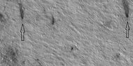 Ridges, believed to be eskers of the Dorsa Argentea Formation, as seen by Mars Global Surveyor wide angle MOC. White arrows point to the ridges.