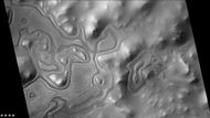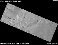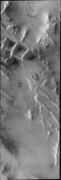 The quadrangle also contains Angustus Labyrinthus, a formation of intersecting valley or ridges, nicknamed the "Inca City".[7] Researchers were surprised to see parts of the surface having a Swiss-cheese appearance. Also, some areas showed strange spider-shaped forms, which were determined to be caused by carbon dioxide gas blowing dust around at certain times of the year.