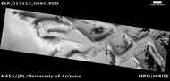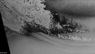 Dunes and defrosting spots in Richardson Crater, as seen by HiRISE. It is thought that films of liquid water sometimes exist in and around the dark spots.
