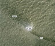 Dust Devil, as shown from HiRISE. Dust devil is moving to the upper left, leaving a dark track to the lower right. The shadow of the dust devil is to the upper left of the dust devil.