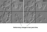 Changes in South Pole surface from 1999 to 2001, as seen by Mars Global Surveyor.