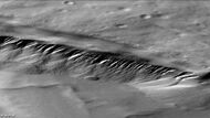 Some craters in Mare Australe show gullies. Martian gullies are small, incised networks of narrow channels and their associated downslope sediment deposits, found on the planet of Mars. They are named for their resemblance to terrestrial gullies. First discovered on images from Mars Global Surveyor, they occur on steep slopes, especially on the walls of craters. Usually, each gully has a dendritic alcove at its head, a fan-shaped apron at its base, and a single thread of incised channel linking the two, giving the whole gully an hourglass shape.[8] They are believed to be relatively young because they have few, if any craters. A subclass of gullies is also found cut into the faces of sand dunes which themselves considered to be quite young. On the basis of their form, aspects, positions, and location amongst and apparent interaction with features thought to be rich in water ice, many researchers believed that the processes carving the gullies involve liquid water. However, this remains a topic of active research. As soon as gullies were discovered,[8] researchers began to image many gullies over and over, looking for possible changes. By 2006, some changes were found.[9] Later, with further analysis it was determined that the changes could have occurred by dry granular flows rather than being driven by flowing water.[10][11][12] With continued observations many more changes were found in Gasa Crater and others.[13] With more repeated observations, more and more changes have been found; since the changes occur in the winter and spring, experts are tending to believe that gullies were formed from dry ice. Before-and-after images demonstrated the timing of this activity coincided with seasonal carbon-dioxide frost and temperatures that would not have allowed for liquid water. When dry ice frost changes to a gas, it may lubricate dry material to flow especially on steep slopes.[14][15][16] In some years frost, perhaps as thick as 1 meter.