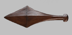 Cut from iron wood, its diamond shaped head is specific to the Solomon Islands.[1] About thirty centimetres long, it has a carved striking head with well-marked ribs. It is native to Malaita island.[2] Besides its common name of supi, it can sometimes be referred to as a supe or subi.[3] Some were carved from whale bones.[4] The handle was sheathed with coconut fibre braiding, sometimes engraved or inlaid with shells. Some, carved with a crocodile face at their end, were reserved for the tribes chiefs.[5]